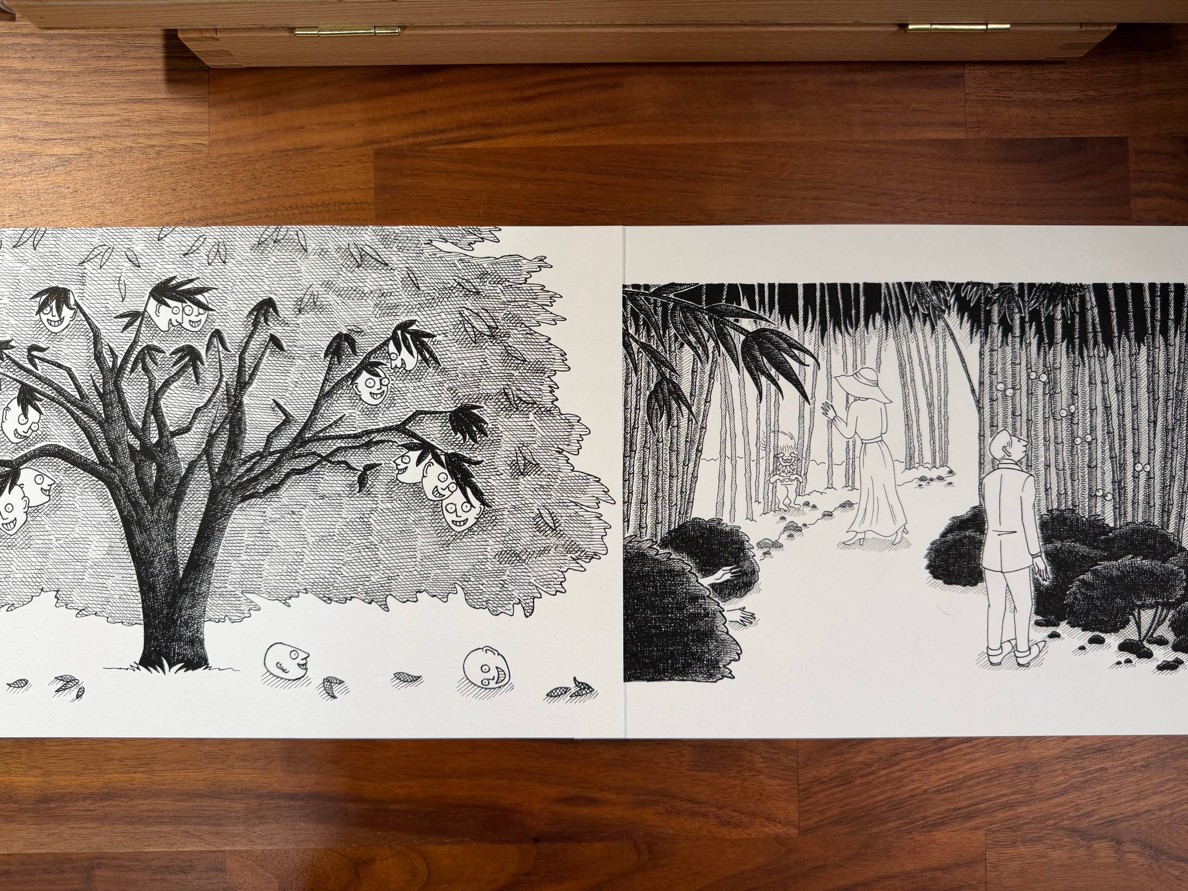 For those of you into yōkai (Japanese supernatural creatures) lore, the bamboo garden features an akagashira on the left and ayōkai-mannendake on the right. The tree with the heads is a jinmenju.
