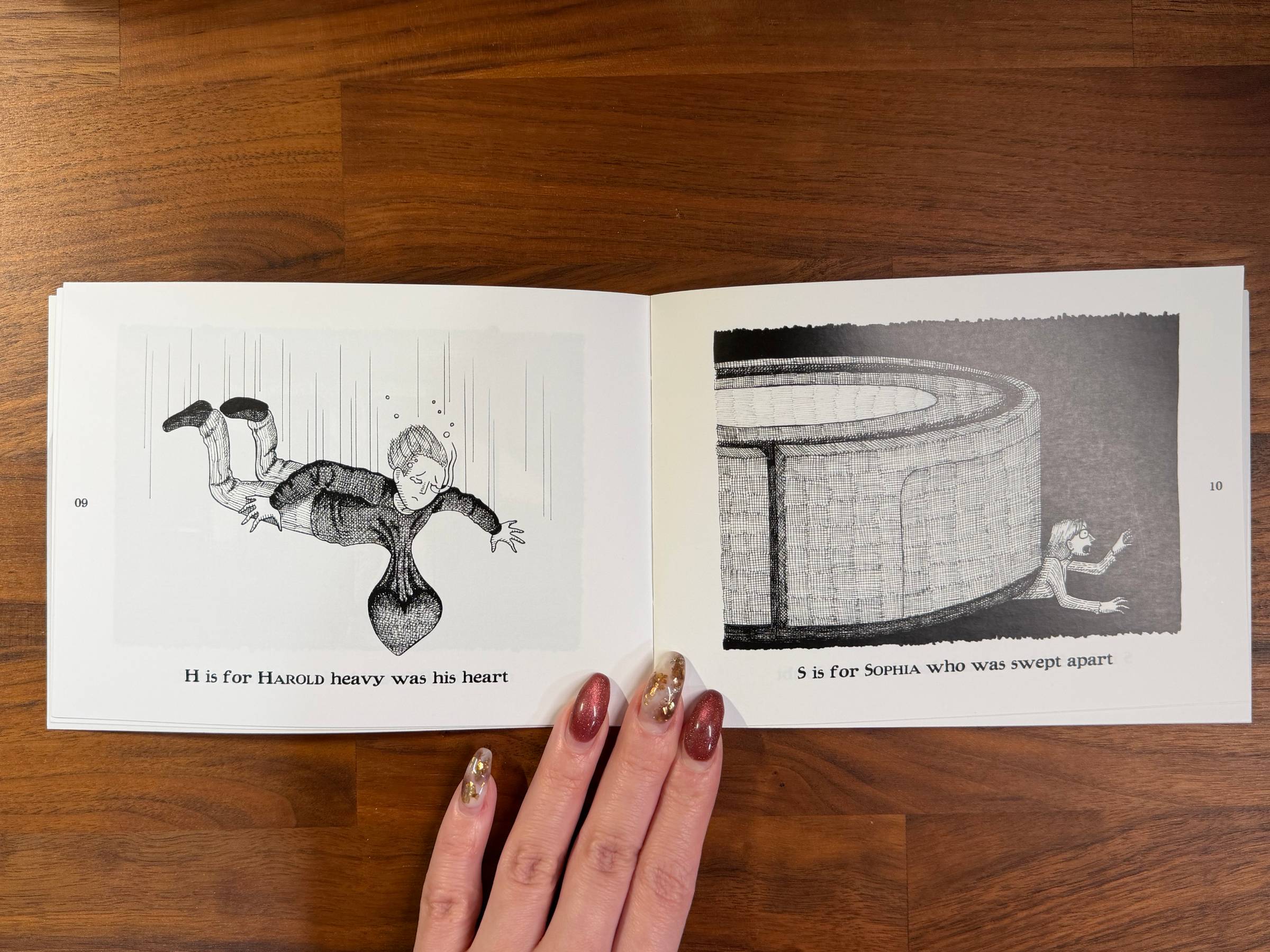 I based it on Gorey's The Gashlycrumb Tinies, but this time the adults are the ones dying hilarious deaths since I have no idea how to navigate laws around depicting dying children.
